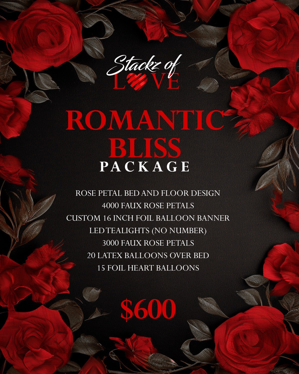 BED DESIGN, 1500 FAUX ROSE PETALS, BALLON BANNER, 20